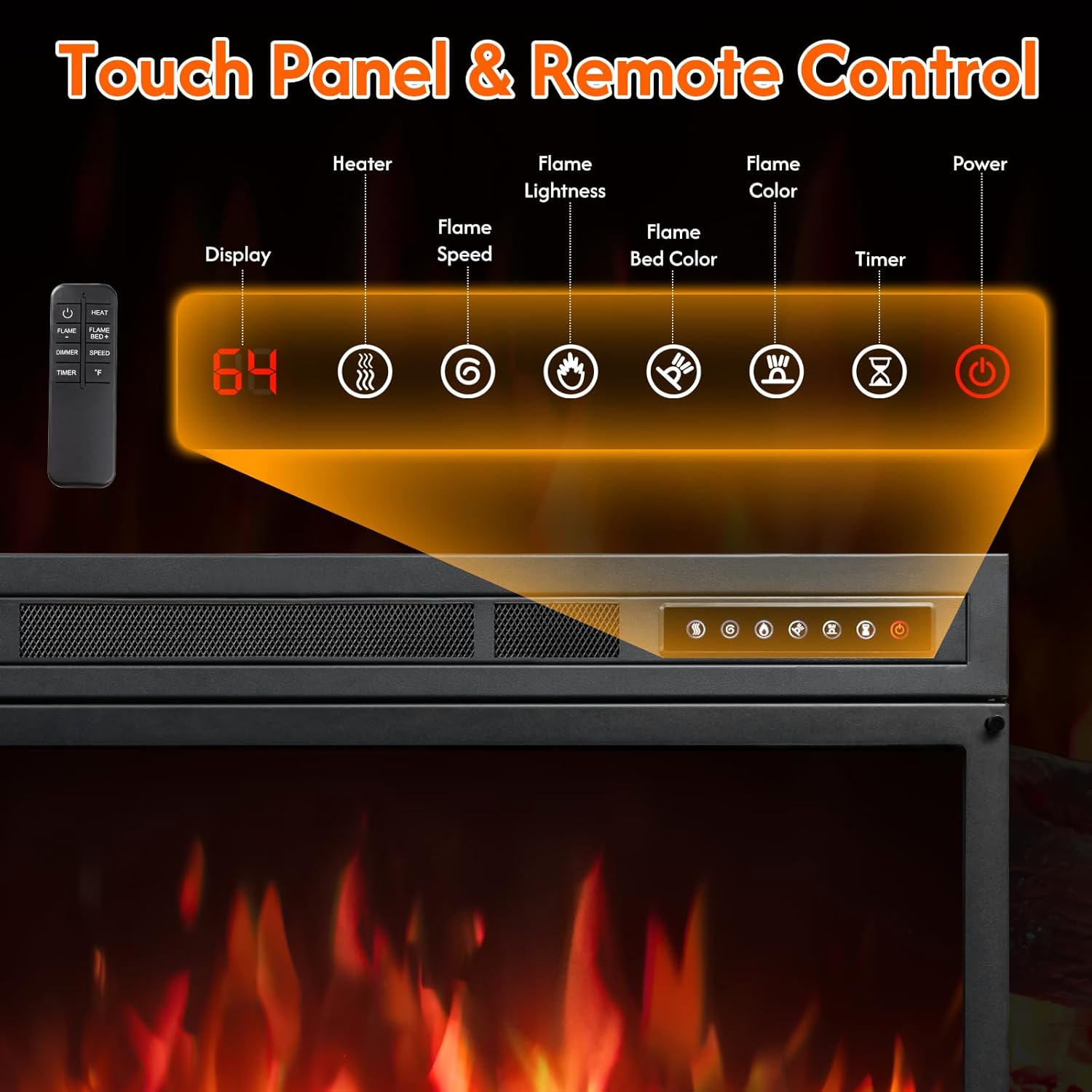 - 【2 control methods & Safety】Fireplace heat can be controlled either by touchscreen or remote, which enables you to operate freely within the room. Electric fireplace insert features tempered glass and has gained certification from ETL. In addition, auto-heat kill safety protection include to avoid the overheating