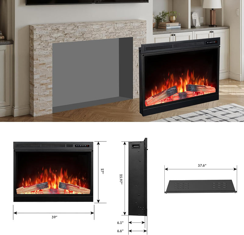 - 【Dimension】Overall dimension: 39"W x 27"H x 6.6"D. Insert dimension: 37.6"W x 25.97"H x 6.1"D. The installation and disassembly of the electric fireplace are very simple. Fireplace heat can be embedded in a cabinet. This embedded fireplace will add a touch of style to your living room, bedroom and office