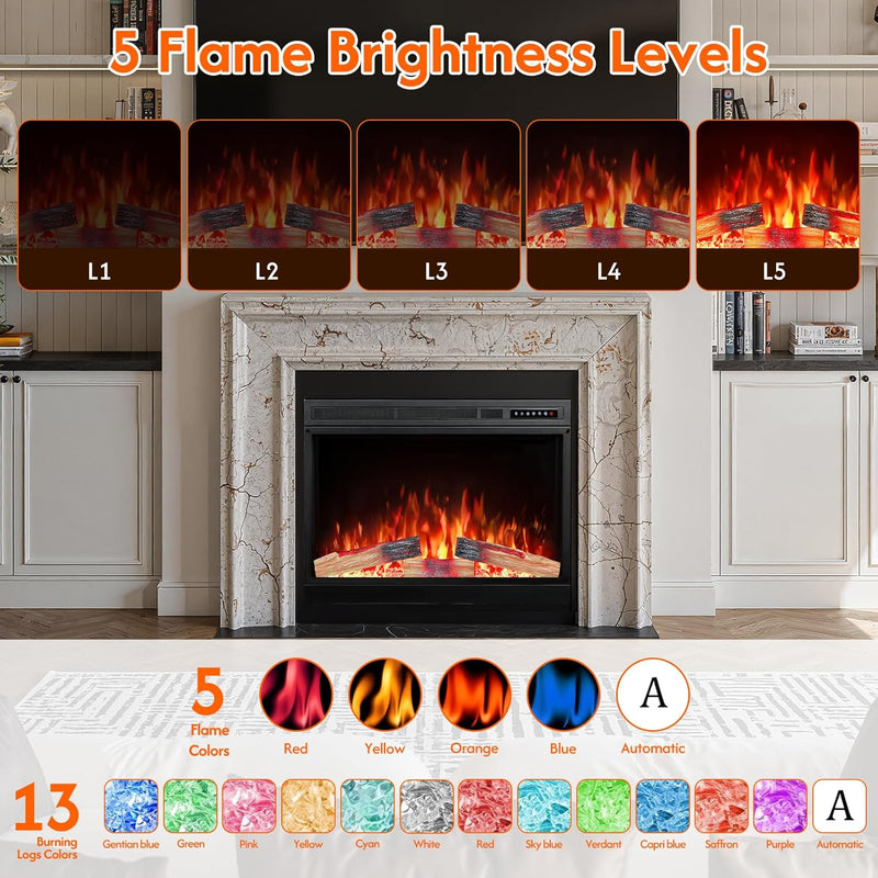 - 【Realistic Flame and Logs & Automatic Color Change Design】Electric fireplace insert features lifelike flames and burning logs. Fireplace heater offers 5 color options for the flames - red, yellow, orange, blue. Besides, the flame bed also has 12 different colors that can be adjusted such as red,gentian blue, cyan, saffron,green, etc. Allow the color of the logs to be freely combined with the color of the flame. Moreover, the color can change automatically. At the same time, the electric fireplace has 5 flame brightness and speed settings, creating a warm atmosphere and presenting vivid flame effects. Special automatic color change design, brings you endless surprise