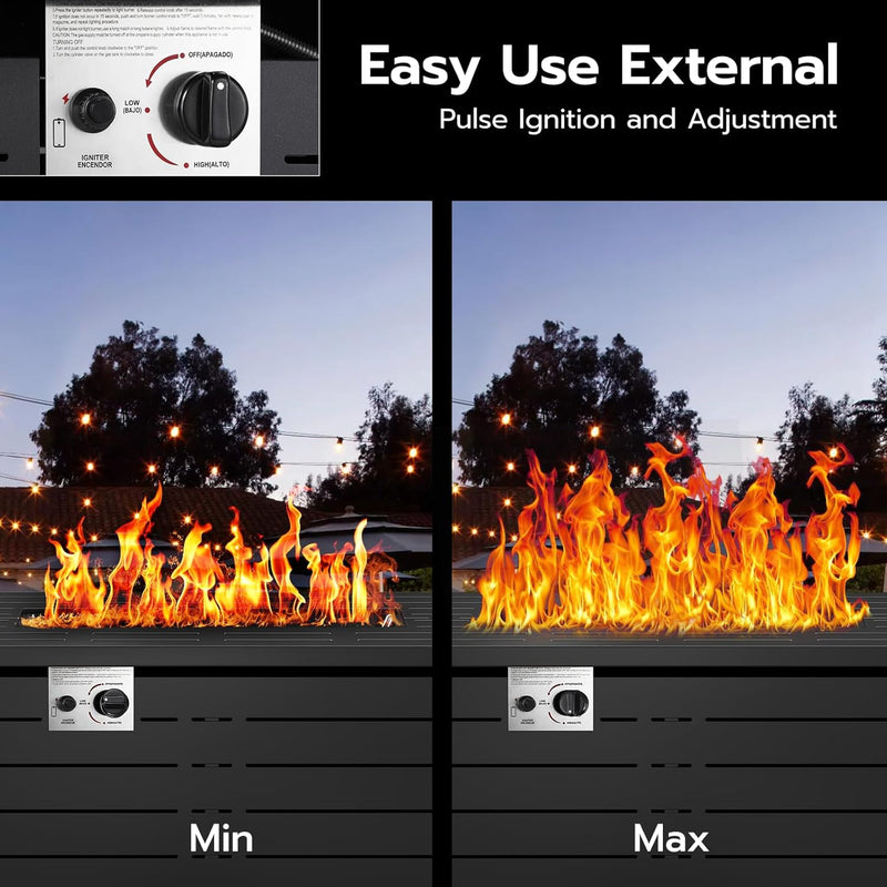 - 【Adjustable Flame & Windproof Performance】 Easily control ambiance via the adjustable flame height. with a powerful combustion system of up to 50,000 BTU (British thermal units) that can be adjusted to your desired flame intensity with a simple turn of the knob. Wind-resistant burner maintains steady flames, perfect for breezy nights on the deck or patio.